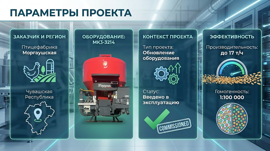 Важно: предприятие уже имело собственное комбикормовое производство. Проект был направлен не на переход к самообеспечению, а на повышение точности, стабильности и экономической эффективности действующей линии.